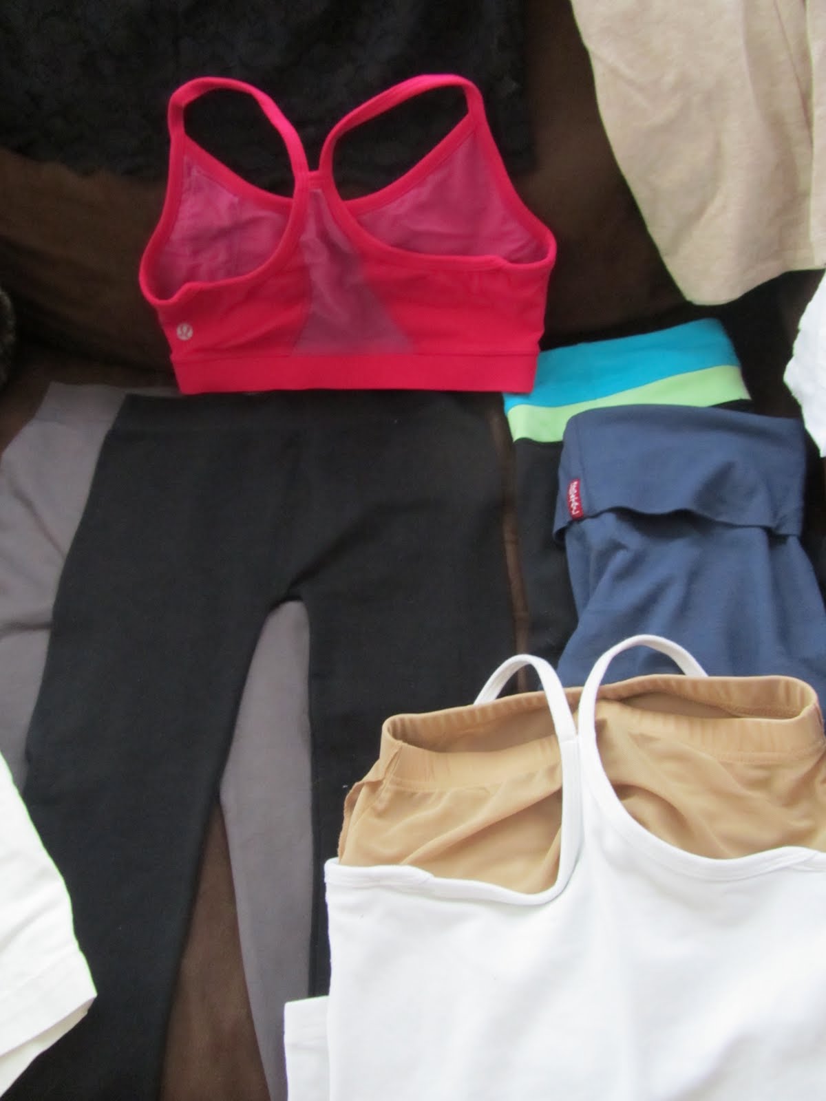 I was talking to my sister a little while ago and mentioned I don't have any shorts- i'm always in yoga clothes. She said she was going to give some away...and she sent these all to me! Besides those two leggings and a few tops (which my Grams bought me) the rest are my sister's "old" clothes that she is giving me. Crazy! This is probably almost as big as all of the clothes I own (at least my summer clothes collection).